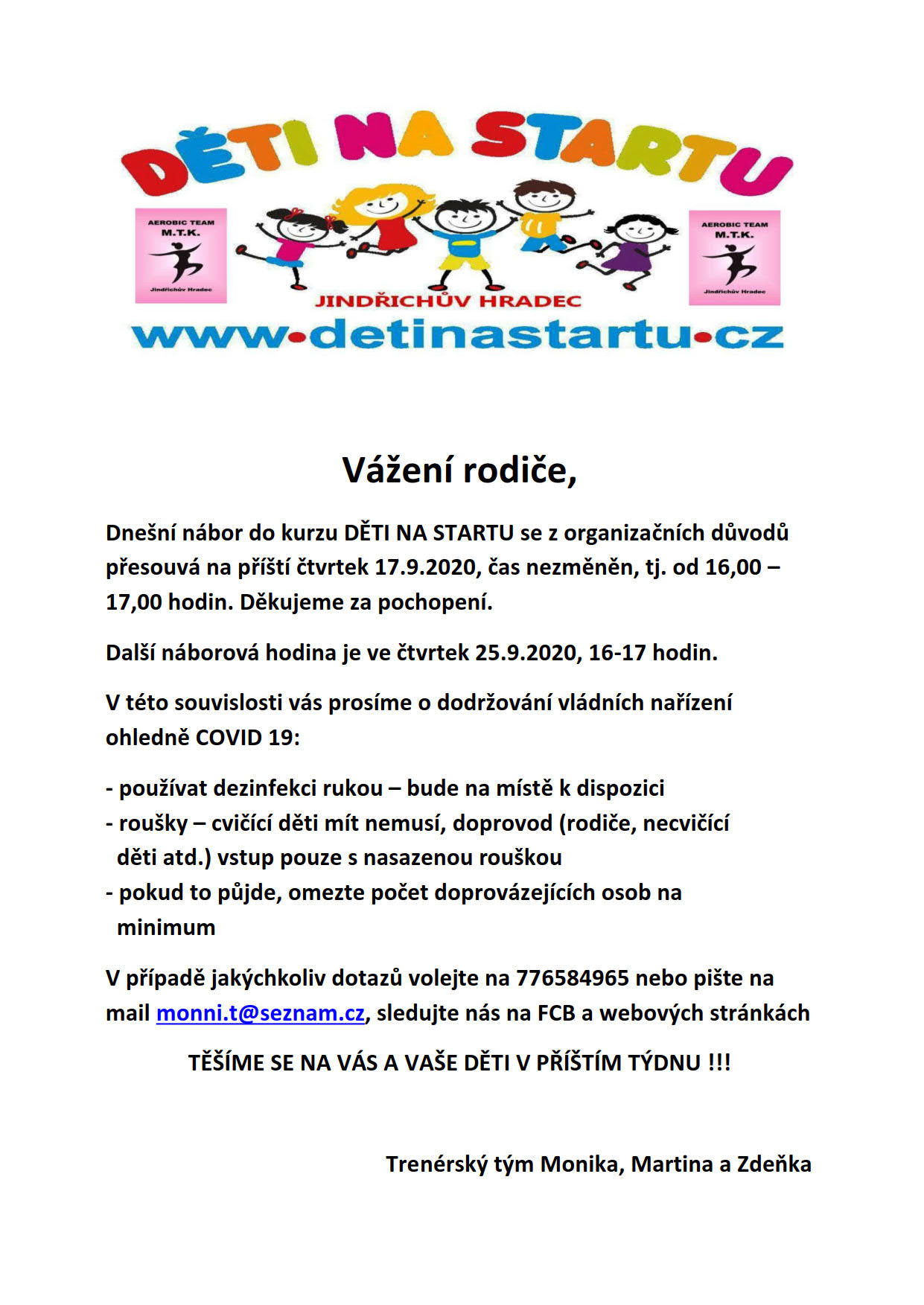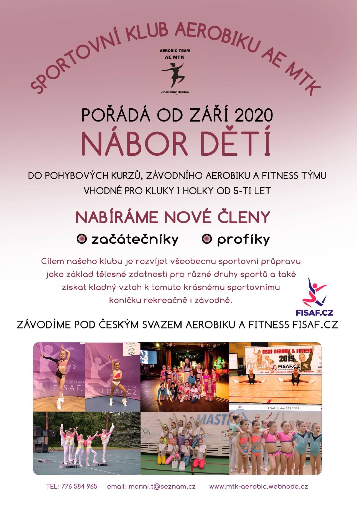 Od příštího týdne bude probíhat ve čtvrtek od 16 do 17 hodin v tělocvičně 1.ZŠ nábor do kurzů Děti na startu. Nábor do přípravky aerobiku probíhá každé pondělí od 15:45 do 16:45 v našem sále na adrese Bratrská 111.